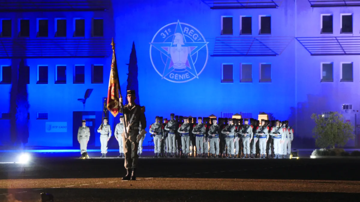 La cérémonie s’ouvre dans une rigueur impeccable. Les façades au fond de la place d’armes s’illuminent : des projections de lumière y dessinent les emblèmes du régiment. Le colonel Basile Caire, chef de corps du 31e régiment du génie, passe les troupes en revue. L’alignement est parfait, les pas claquent juste, les positions ne bougent pas. Une précision qui ressemble à du calme, mais qui raconte surtout une exigence : celle du métier, et celle du régiment.