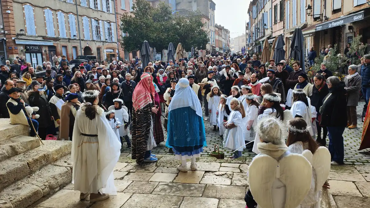 Autour de l’église, les enfants et les jeunes, habillés en anges, bergers et bergères, ajustaient leurs costumes. Les regards se croisaient, les sourires aussi. Déjà, le public commençait à chanter, reprenant les premiers airs qui allaient accompagner toute la matinée. Moissac, ce matin-là, marchait au pas de la crèche.