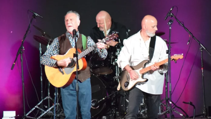 Zachary Richard et Xavier Coron sur scène au Centre culturel Jules Fromage lors d’une soirée consacrée à l’histoire acadienne à Saint-Nicolas-de-la-Grave. Crédit photos Xavier Coron